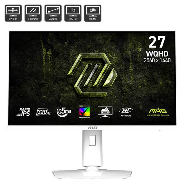 Visualize your victory with the MAG 274QRFW X32 gaming monitor. It boasts a 2560x1440 (WQHD) Rapid IPS panel, 320Hz refresh rate, and rapid 0.5ms (GtG, Min.) response time. VESA certification for DisplayHDR 400 enhancing eye-catching details through adjustments in contrast and shadows. Designed for competitive FPS, first-person RPG/MMORPG, and flight/racing simulator genres, the MSI MAG 274QRFW X32 gaming monitor takes casual gaming to a new level, challenging players to see beyond the game.