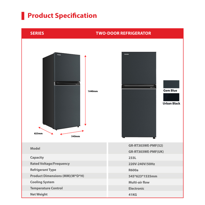 VMALL Toshiba Refrigerator Top Mounted Freezer Inverter,Double door,233L-GR-RT303WE-PMFC(52)